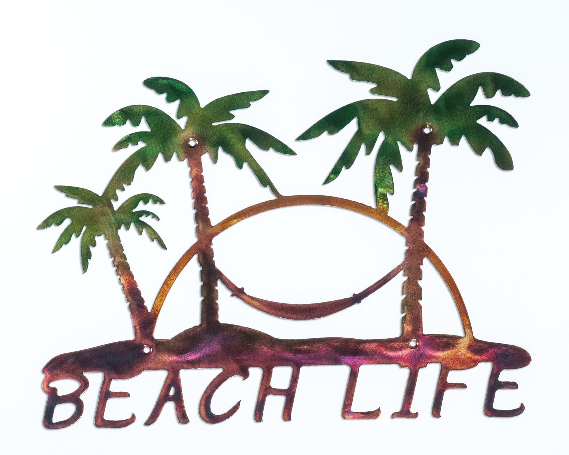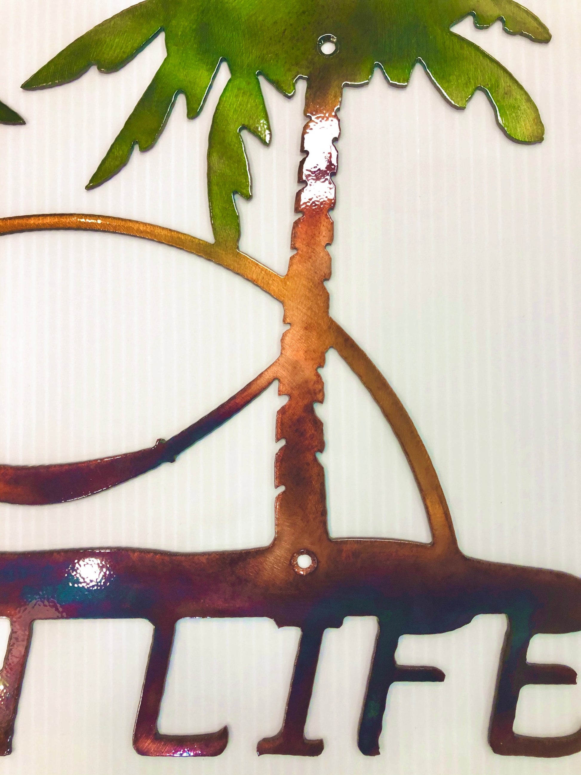 This metal wall art piece features the words Beach Life with a hammock strung between palm trees with a coastal sunrise in the background. This piece is plasma cut from 14 gauge steel. The finish is a hand applied copper plating with metal alcohol dye highlights and has a clear powder coat baked on to make it durable enough for indoor or outdoor display. We have multiple sizes available. Choose from 16"W x 12-1/4"H, 24"W x 18-1/2H, or 32"W x 24-1/2"H