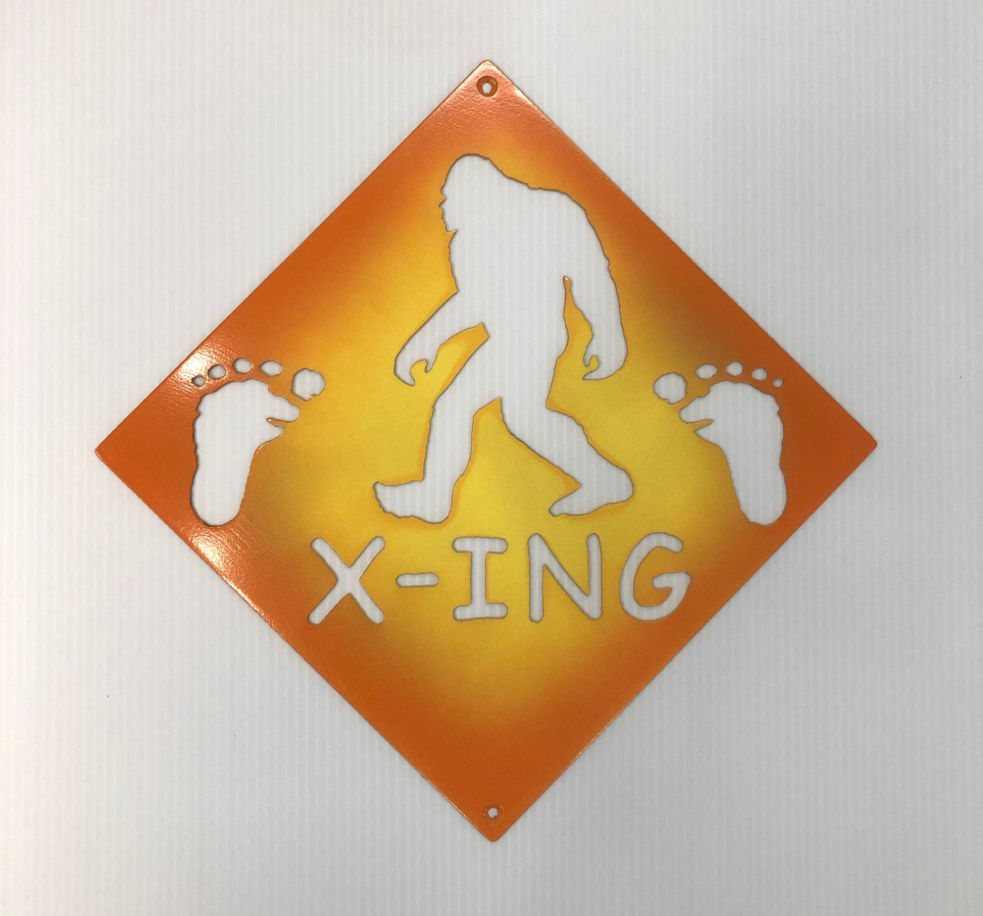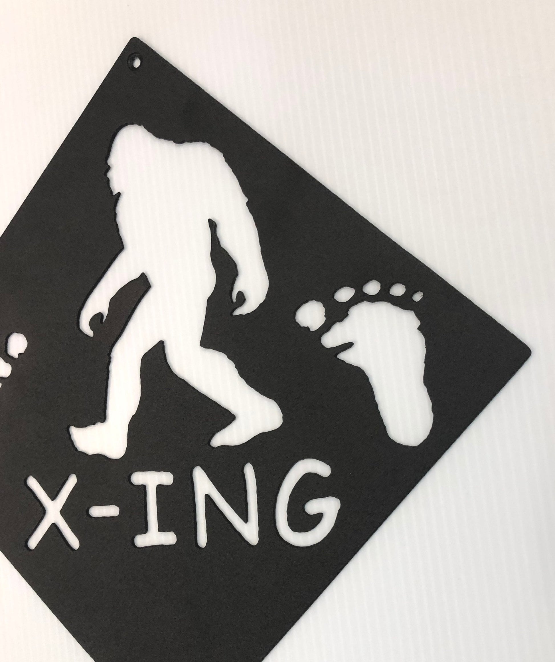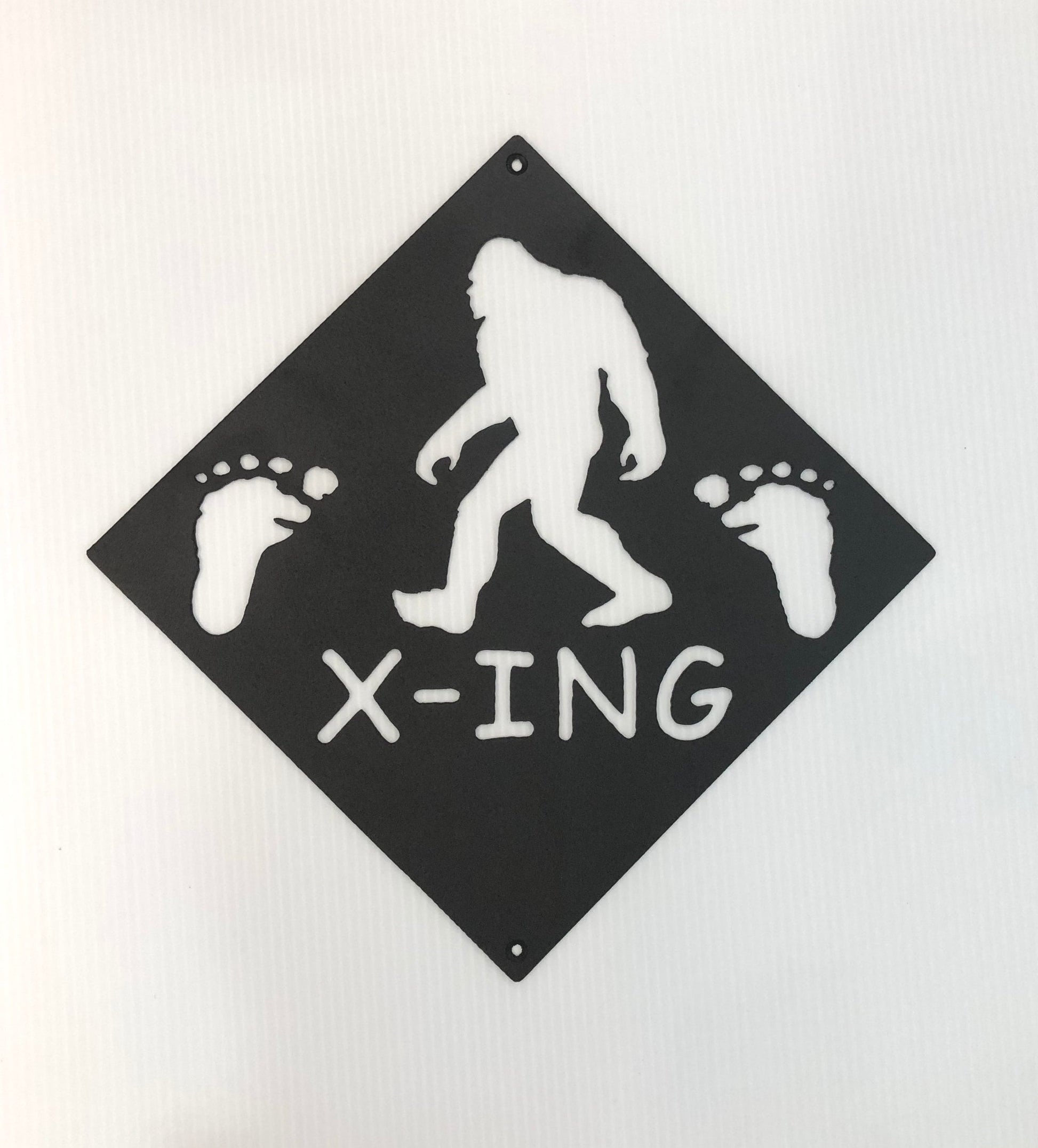 A perfect gift for the Bigfoot enthusiast in the family. This street sign features a Bigfoot or Sasquatch walking with the word "X-ING" and 2 Sasquatch footprints cut into the steel. It's plasma cut from 14 gauge steel. You can choose from a textured black, or Orange/Yellow powder coated finish. It measures approximately 14" wide x 14" high and it weighs approx. 1 lb. It can be displayed indoors or outdoors. We also have other Bigfoot pieces available, including Bigfoot Street Signs, Bigfoot Crossing Signs, and more. As always this piece can be customized. Let us help you "turn your ideas into steel".