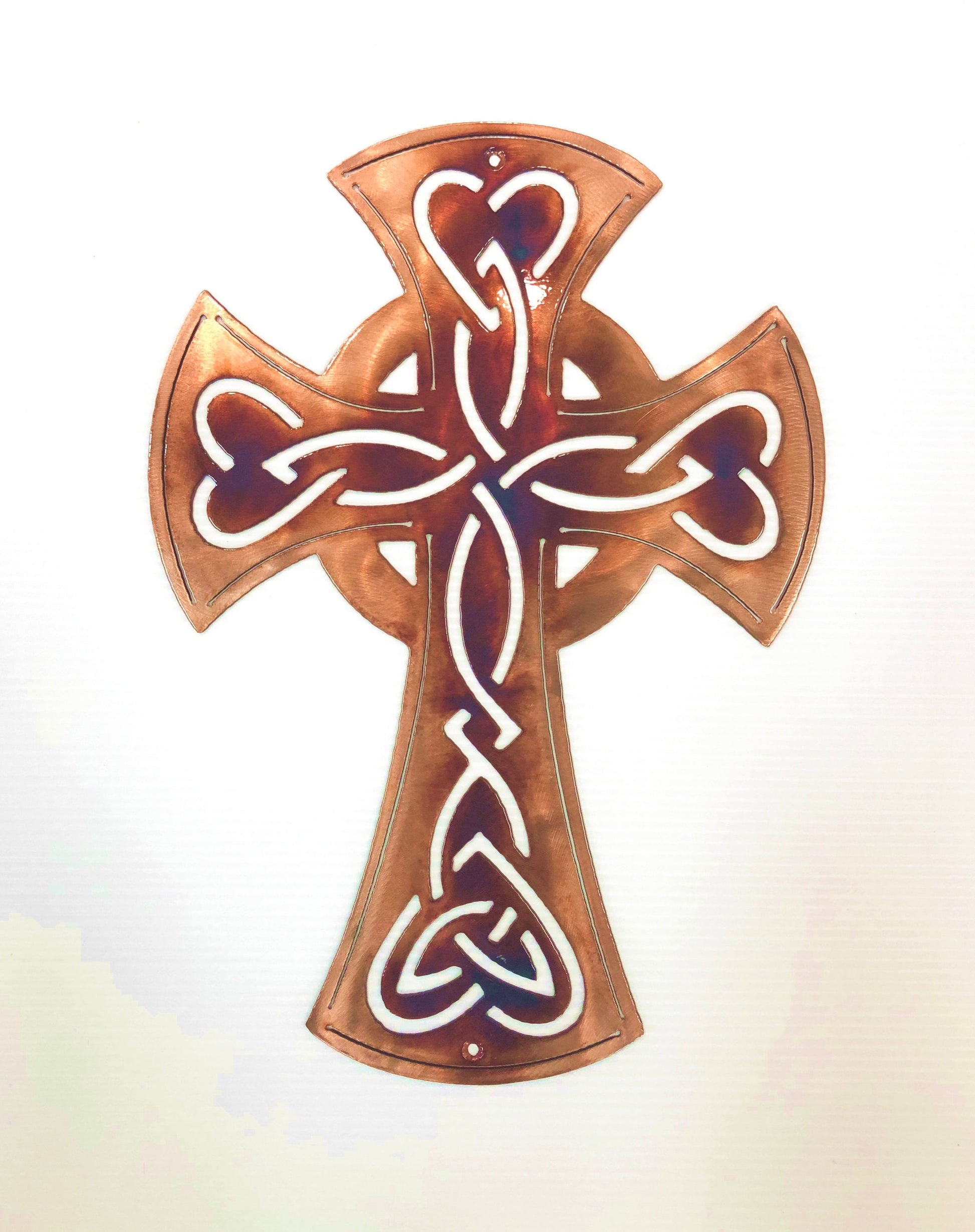 Celtic Trinity Cross with heart shaped details to give your decor a touch of Irish or Scottish heritage. It is plasma cut from 14 gauge steel. It has a hand applied multi-colored patina finish with a baked-on clear powder coat. It measures approximately 11-1/4" wide x 16" high and it weighs approx. 1 lb. It can be displayed indoors or outdoors. As with most of our metal art, this piece can be customized. Let us help you "turn your ideas into steel".