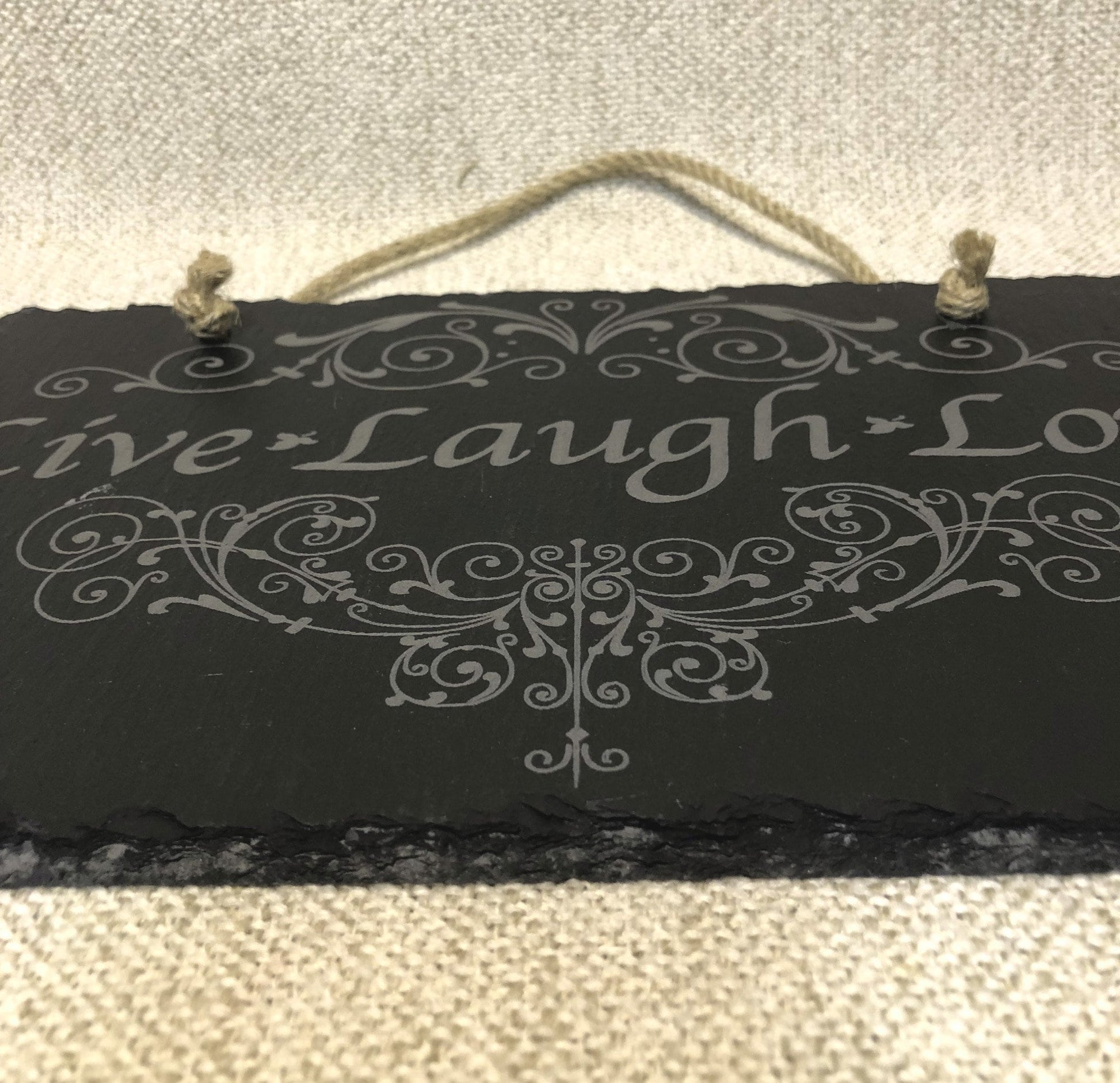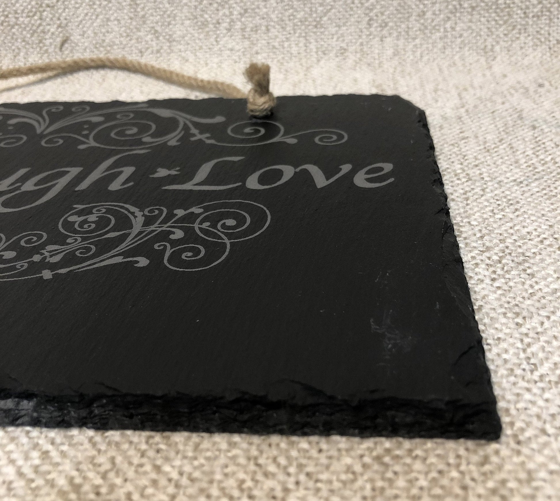 Laser engraved slate wall sign with personalized monogram. This coated slate sign comes with your custom monogram laser engraved into the finish. It will laser engrave a light gray (slate) color. We can add your name, established or wedding date, and most any info you'd like on this piece. It comes with a length of jute rope for easy hanging on a door or wall, or it can be displayed on a shelf using an easel or by leaning against a wall.