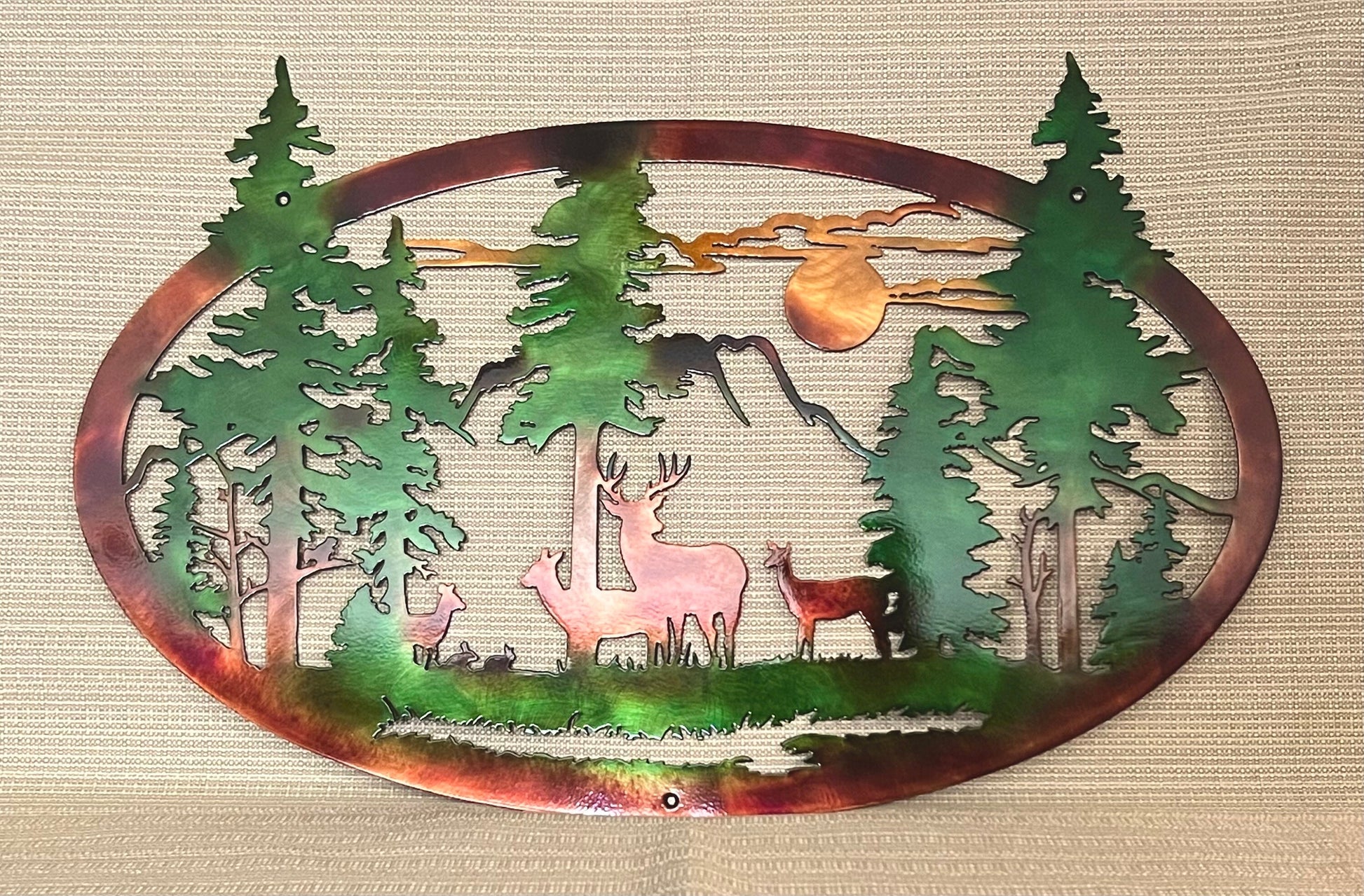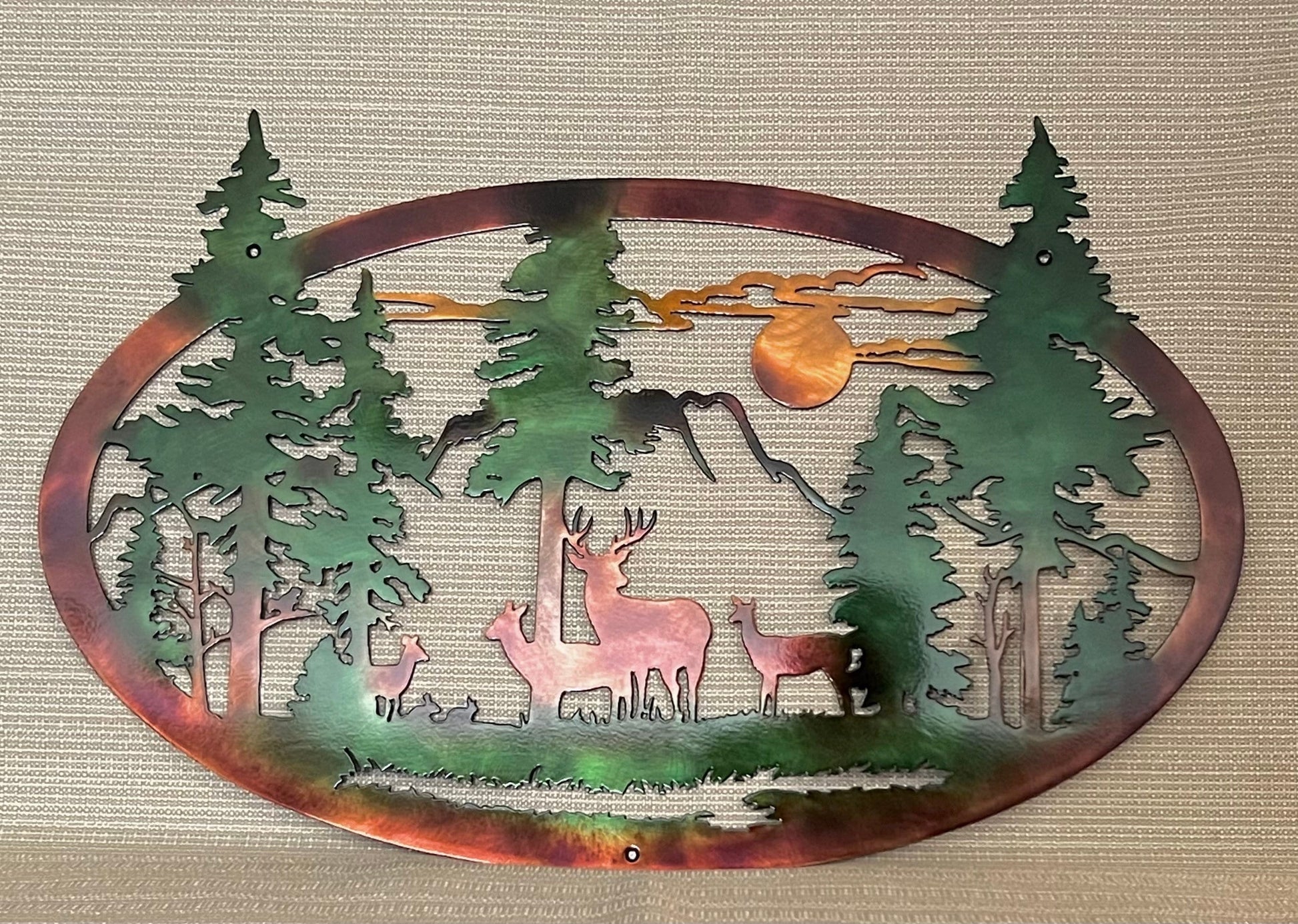 This plasma cut metal art piece depicts a family of whitetail deer with mountains and trees in the background in an oval frame with tops of the trees extending outside the frame. If you look closely there’s even a couple squirrels on the tree branches and rabbits on the ground. It is plasma cut from 14 gauge steel and has a hand applied patina finish with a baked-on clear powder coat. Each one of these we make will look somewhat different due to the hand finished patina. It can be displayed indoors or outdoors. It measures approximately 28" wide x 18" high and it weighs about 4 pounds.