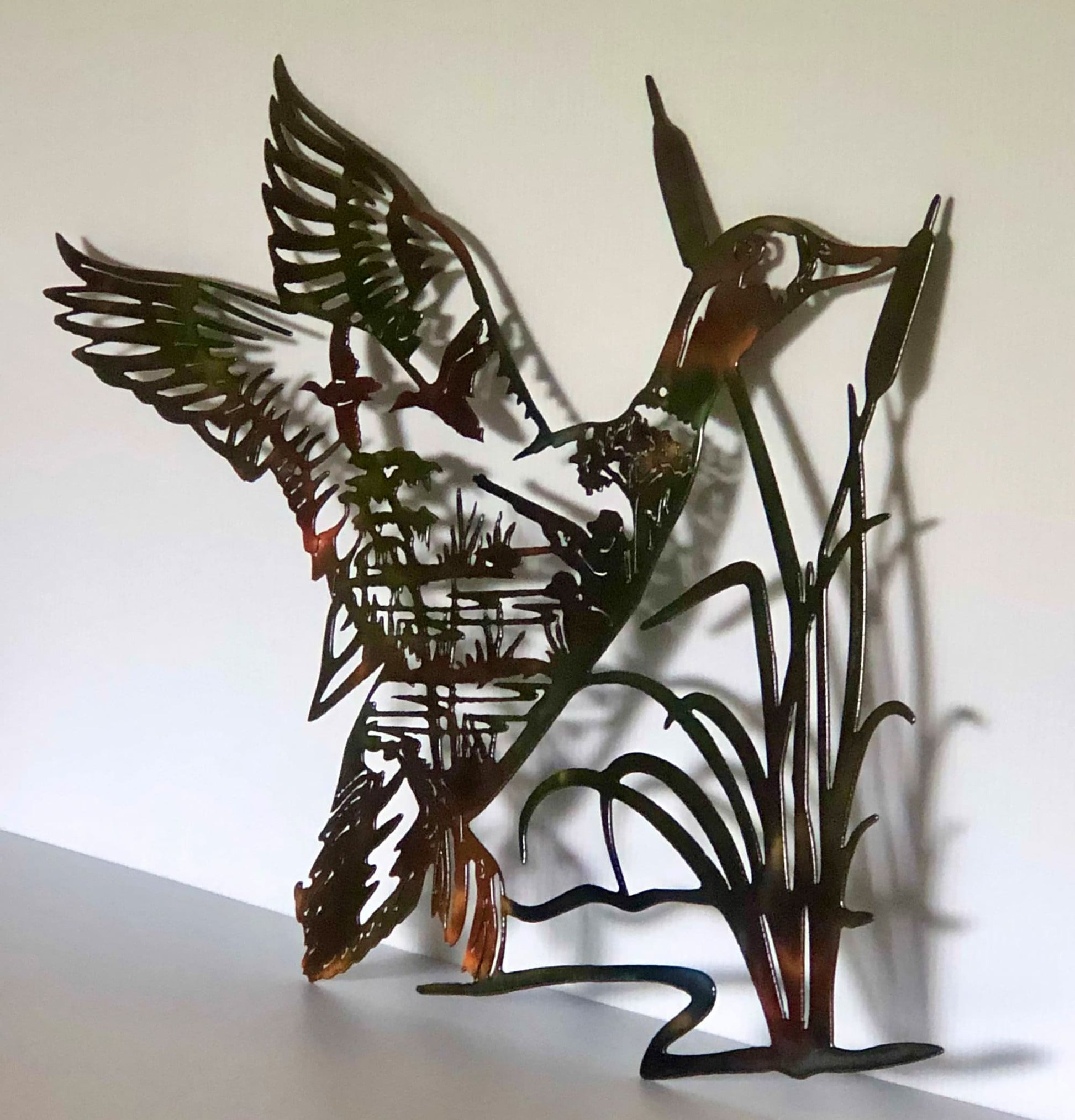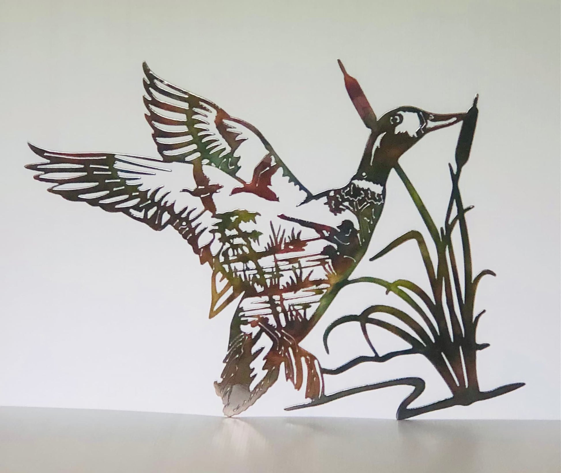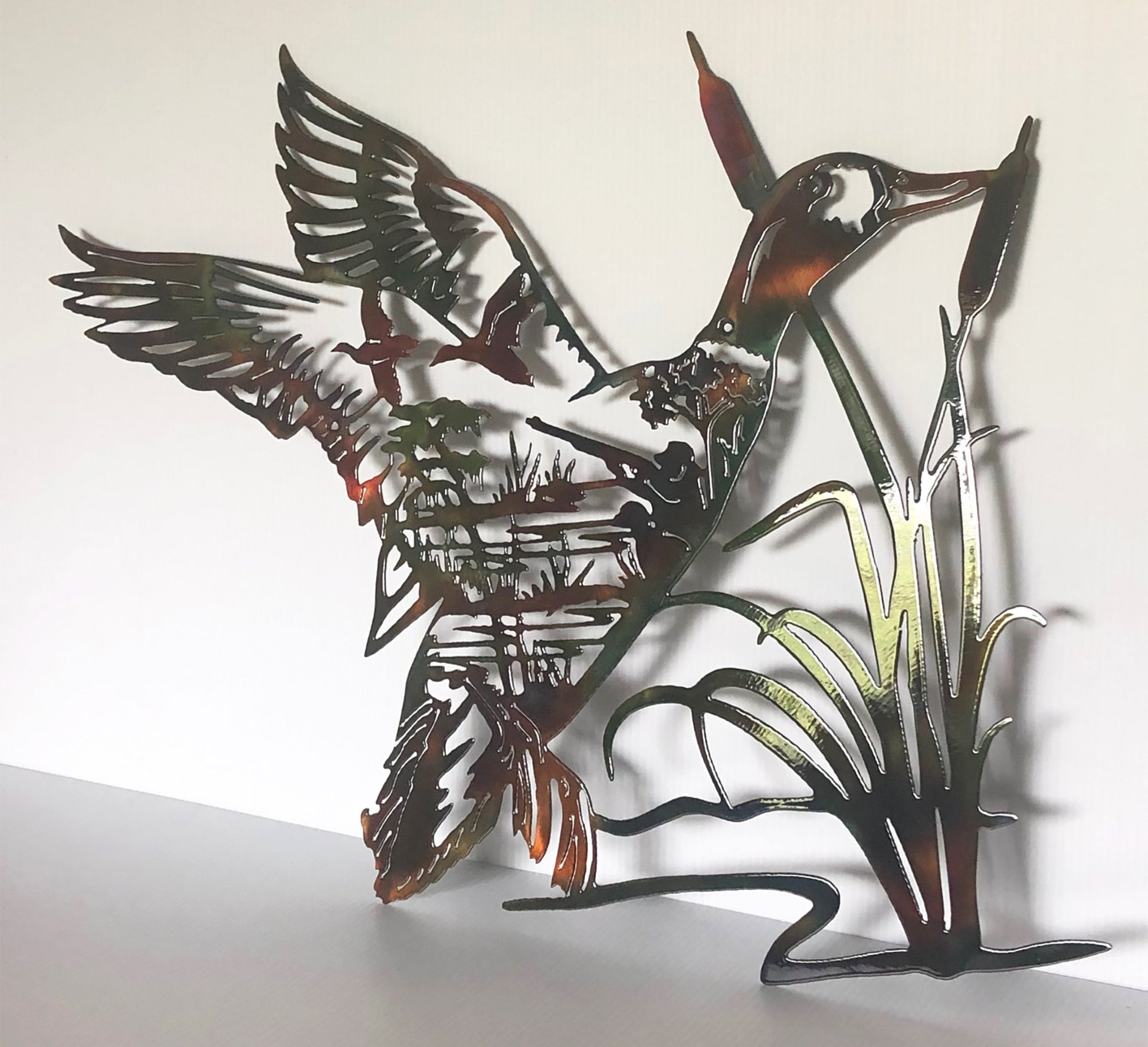 This indoor or outdoor metal wall art piece features a duck hunter with his retriever dog next to him spending the day hunting mallard ducks. This piece can make a great accent piece above a fireplace or doorway in your home or beach house or lake house. The finish is a hand applied airbrushed finish using metal solvent dyes that we make. It has a durable clear powder coat finish to keep the piece looking good for many years and can be displayed indoors or outdoors. The colors will change depending on the intensity, color, and angle of lighting. This metal art piece is approximately 24" wide x 20" high and made from 14 gauge steel. It has holes that can be used for mounting on any flat wall surface. As always this piece can be customized to make it just as you'd like it.