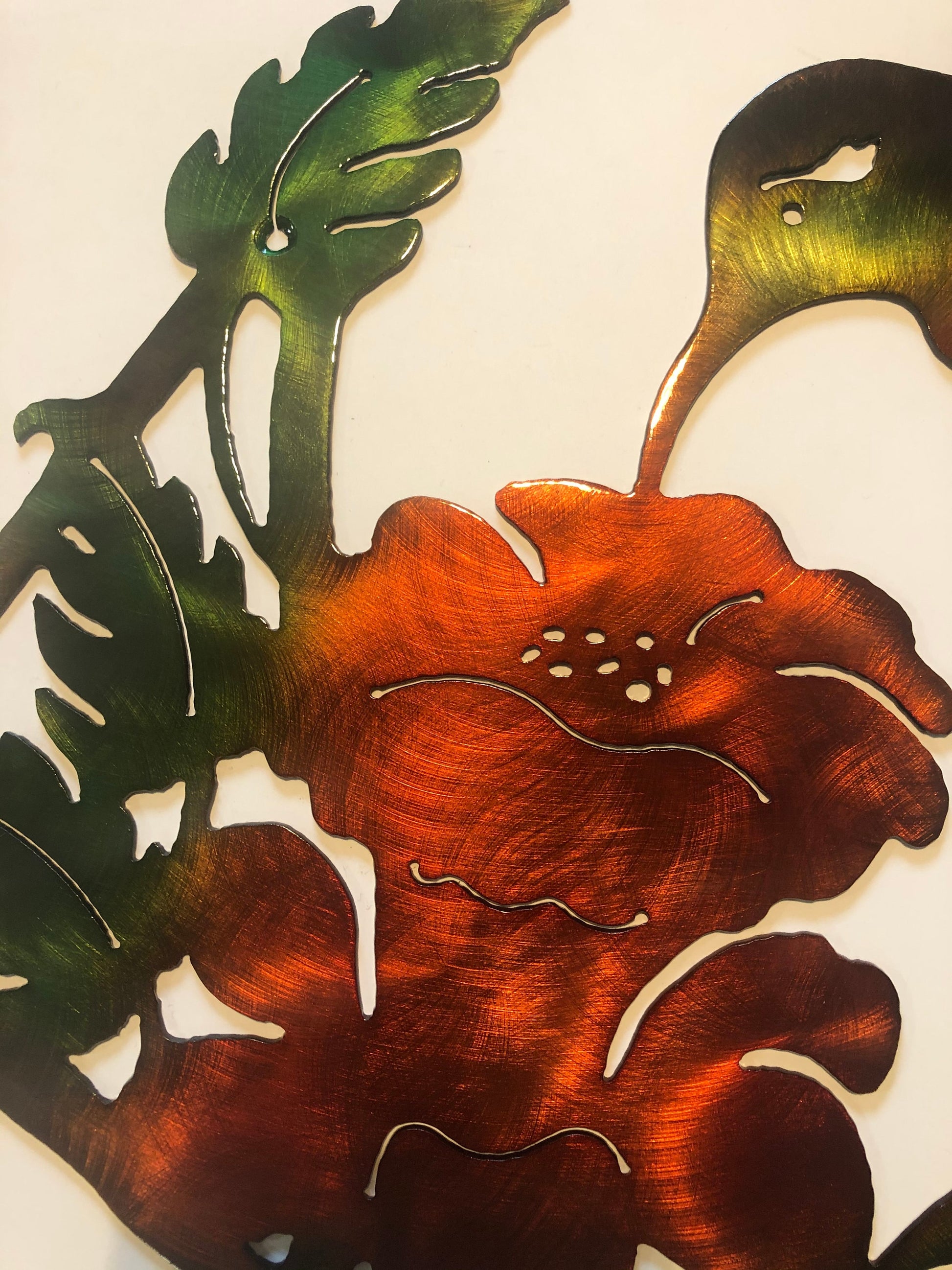 This piece depicts a hummingbird feeding on flower nectar. It's plasma cut from 14 gauge steel and has a multi-colored patina finish with a baked-on clear powder coat. It measures approximately 20" wide x 20" high and it weighs approx. 2 lbs. It can be displayed indoors or outdoors.
