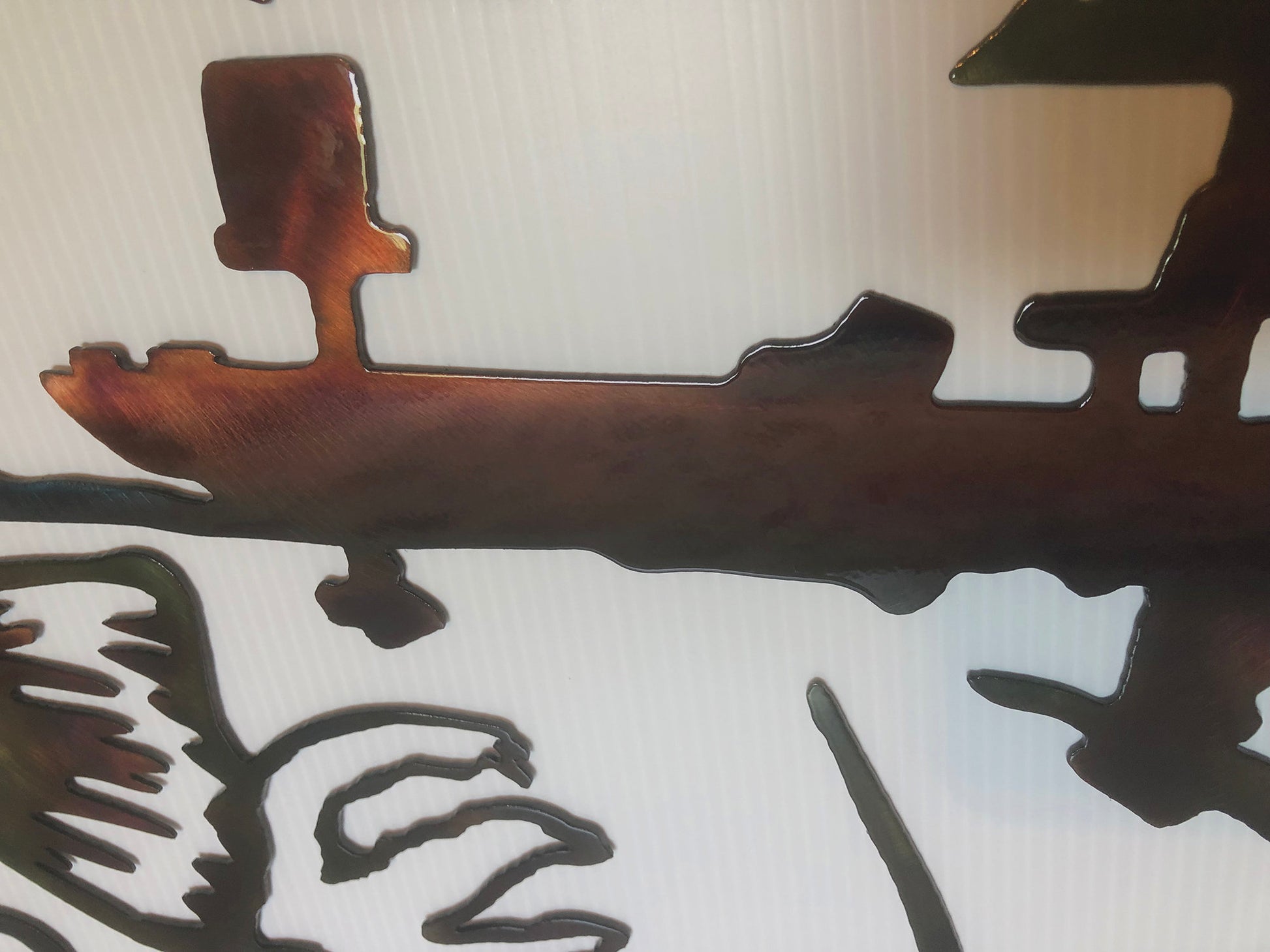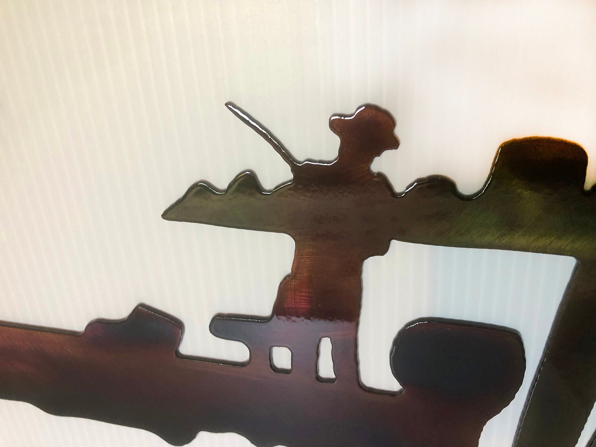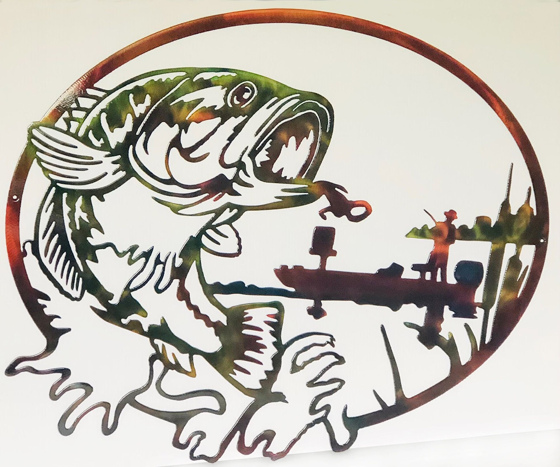 This metal wall art piece features a largemouth bass jumping out of the water as it's caught by a fisherman in a boat. This piece can make a great accent piece above a fireplace or doorway in your home or beach house or lakehouse. The finish is a hand applied airbrushed finish using metal solvent dyes that we make. It has a durable clear powder coat finish to keep the piece looking good for many years and can be displayed indoors or outdoors. The colors will change depending on the intensity, color, and angle of lighting. This metal art piece is approximately 30" wide x 24" high and is plasma cut from 14 gauge steel. it has holes on each end that can be used for mounting. As always this piece can be customized to make it just as you'd like it.