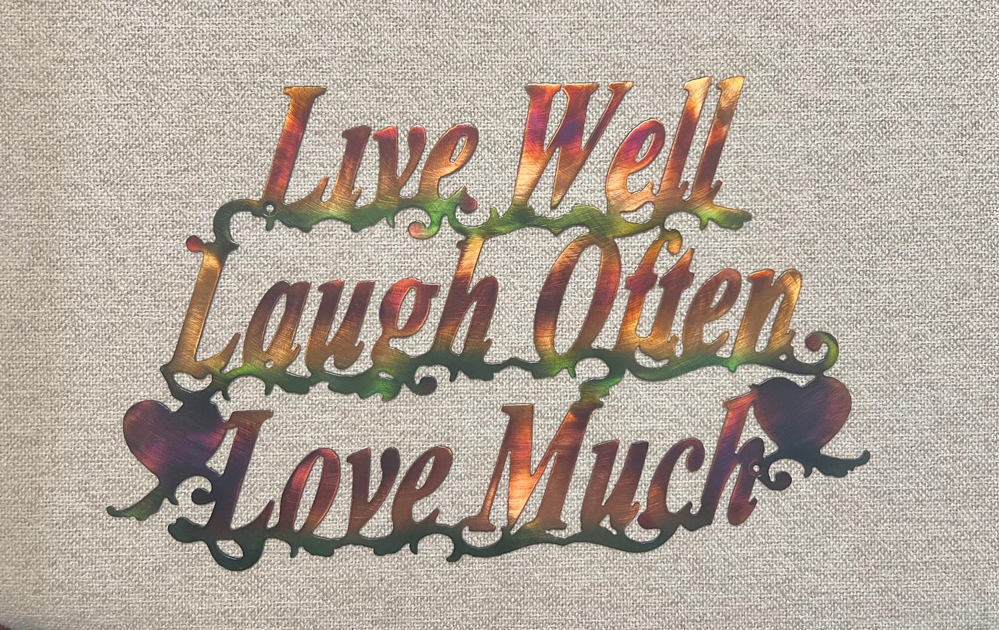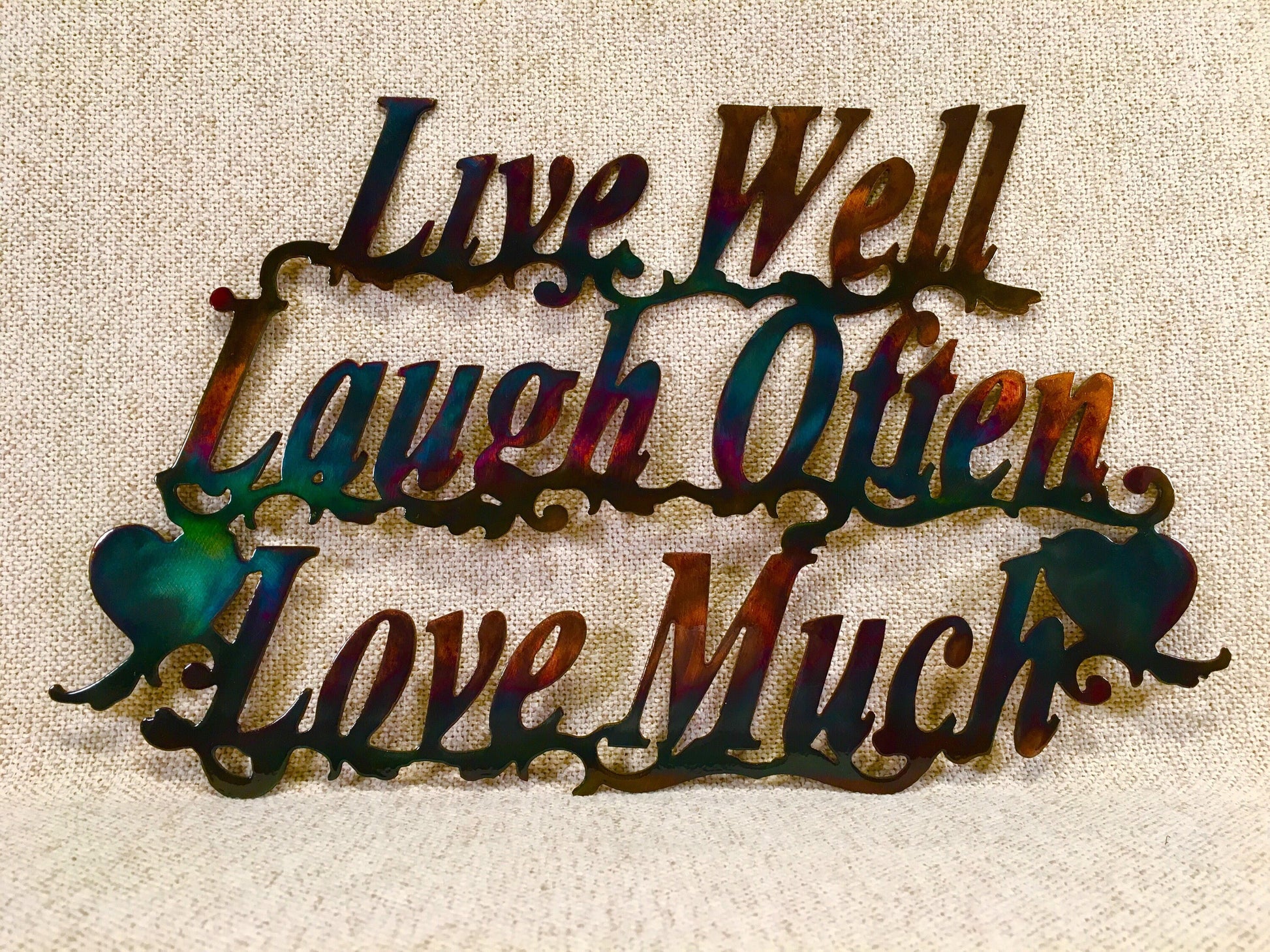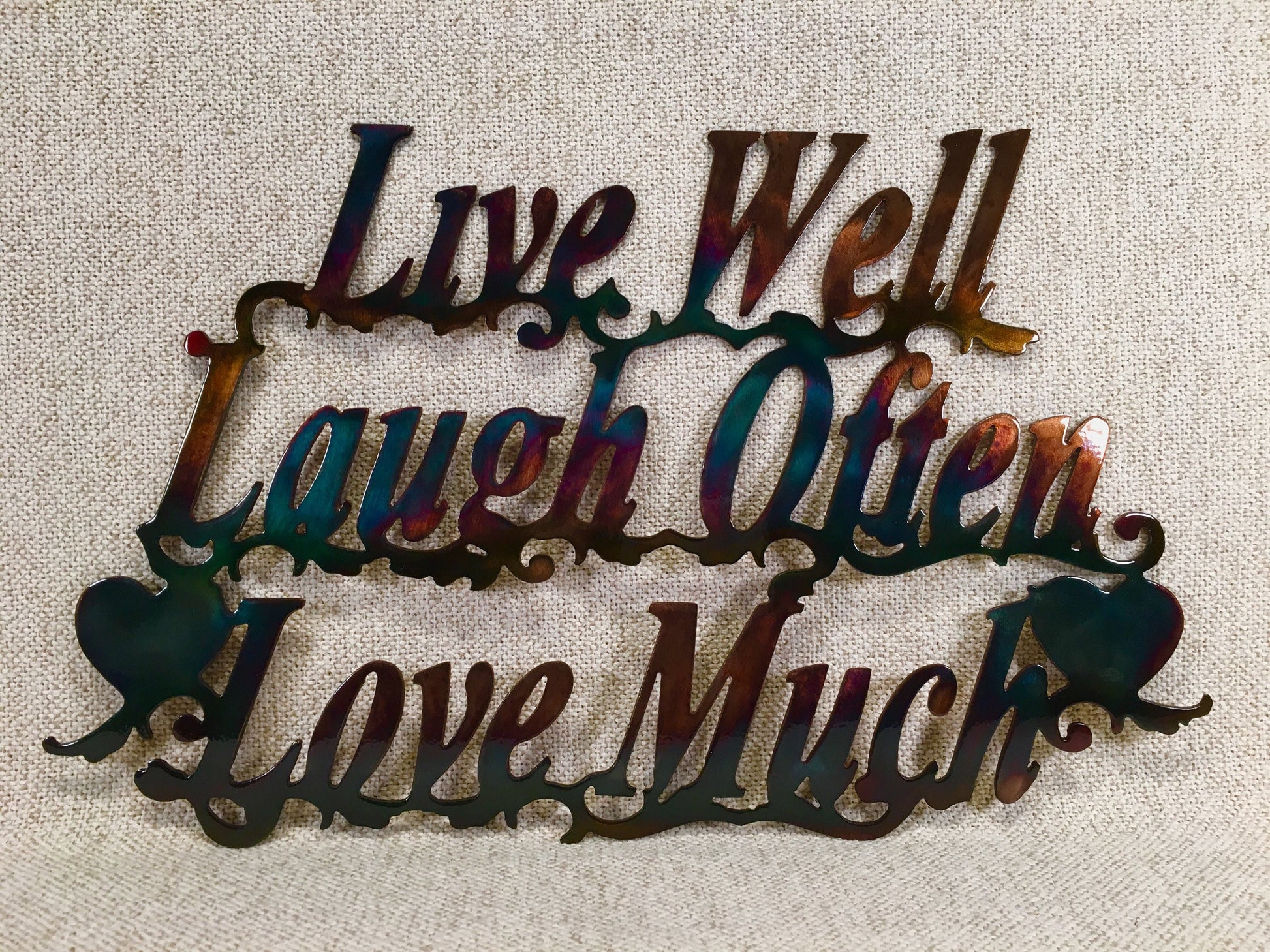 This metal wall art piece features the words "live well, laugh often, love much. It's cut from 14 gauge steel and has a copper and patina finish with highlights of color ranging from red, blue, maroon, copper, and more.