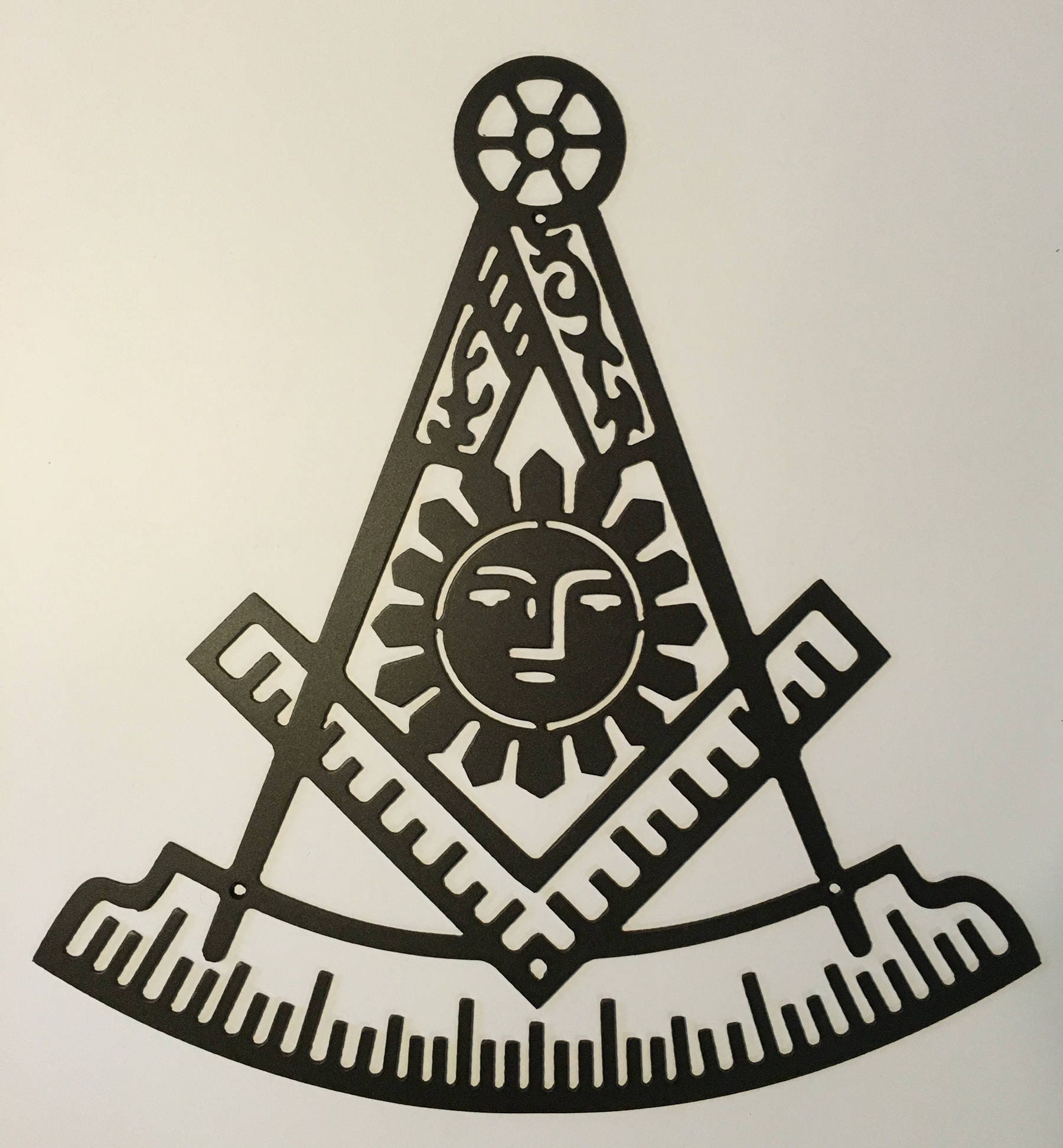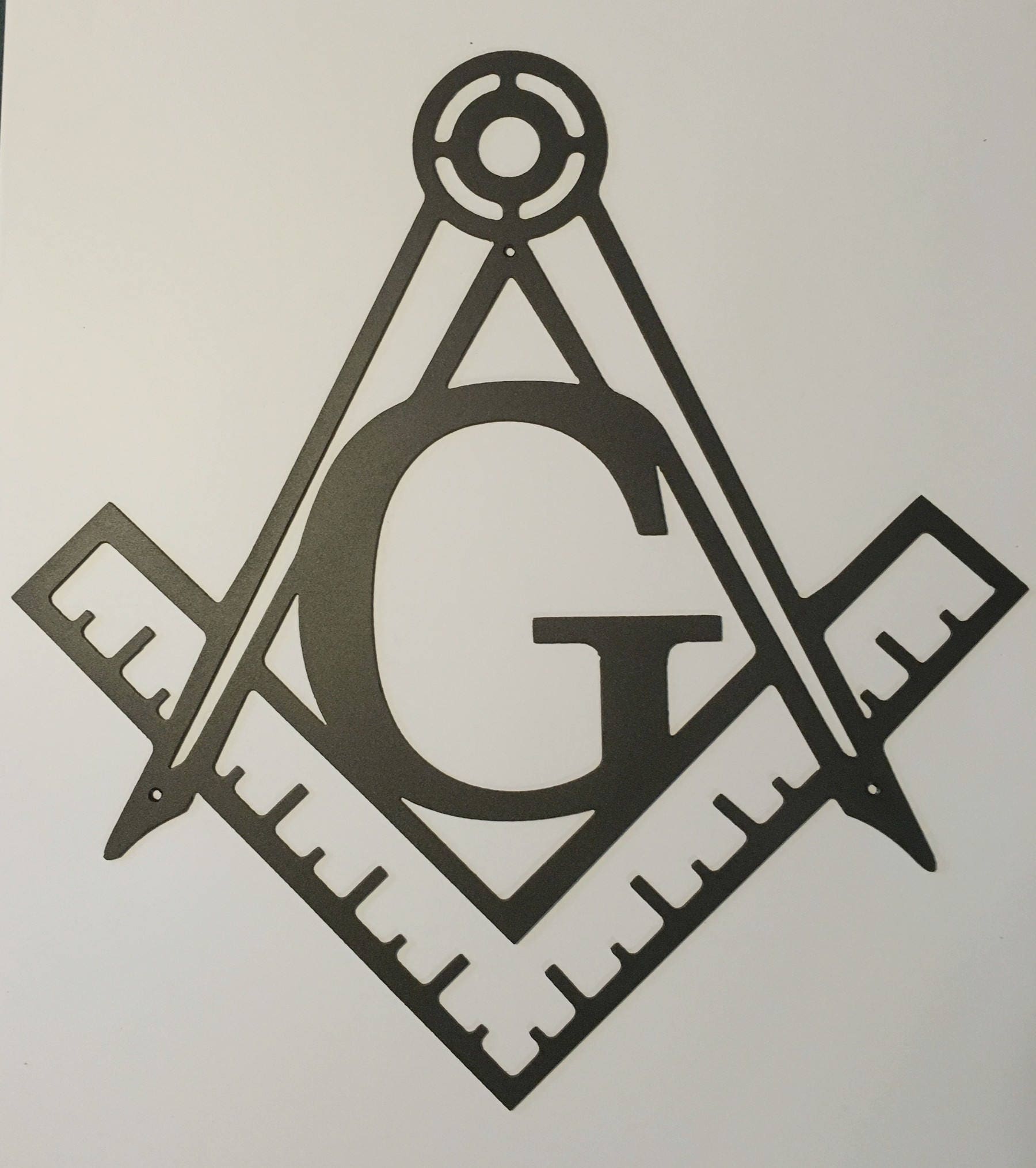 This wall sign is based off the Masonic Square & Compass. It's cut from 14 gauge steel and has a baked on powder coat finish. It can be displayed indoors or outdoors. We offer three standard sizes. The smaller one is approximately 12"H x 10"W. The medium measures approximately 18" high x 16" wide. The larger one is approximately 24"H x 21"W.