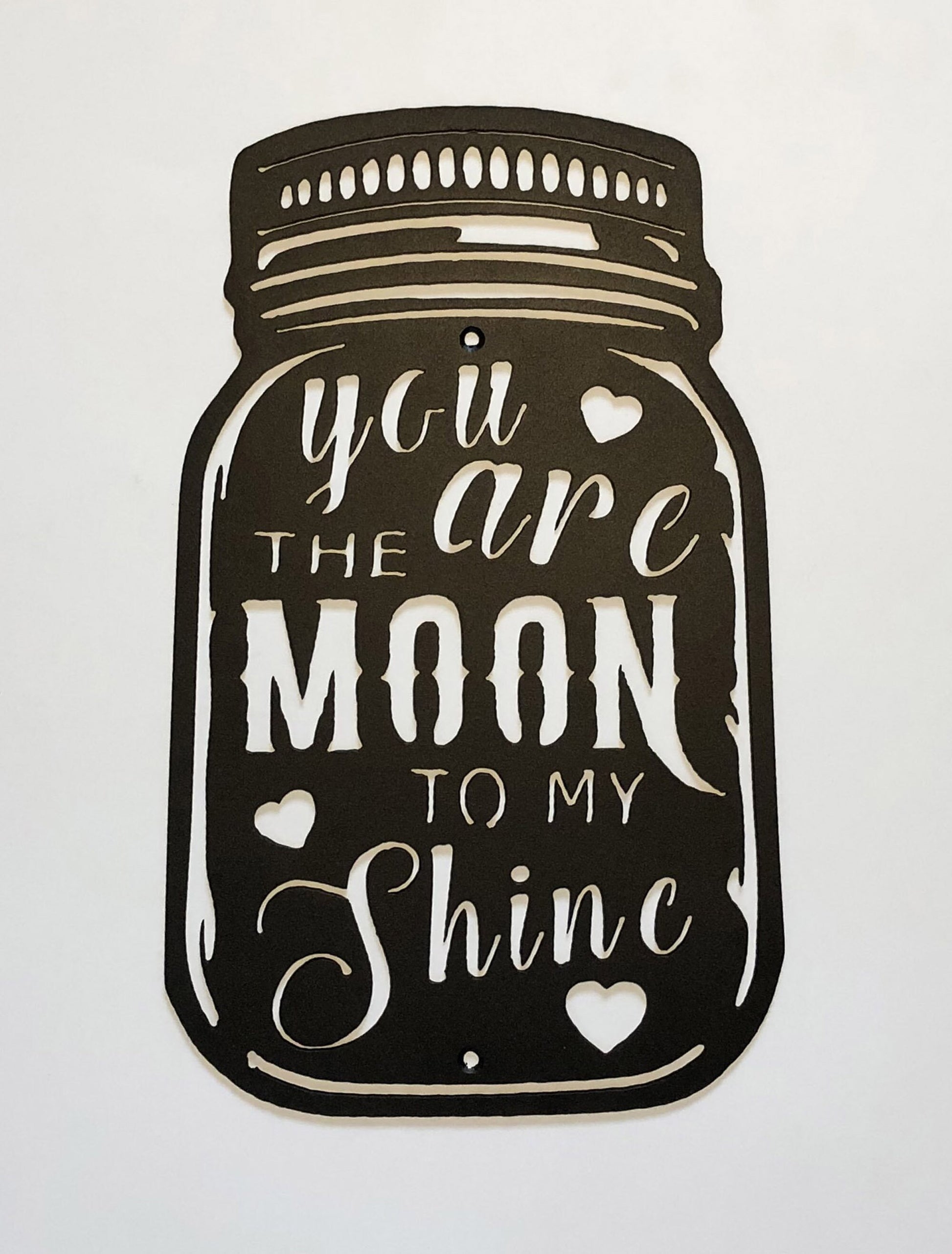 This piece features a moonshine jar with the words "You Are The Moon To My Shine" with small heart accents. It's plasma cut from 14 gauge steel. You can choose from a multi-colored patina finish with a baked-on clear powder coat or a textured black powder coated finish. It measures approximately 8-1/4" wide x 14" high and it weighs approx. 1 lb. It can be displayed indoors or outdoors. As always this piece can be customized. Let us help you "turn your ideas into steel".