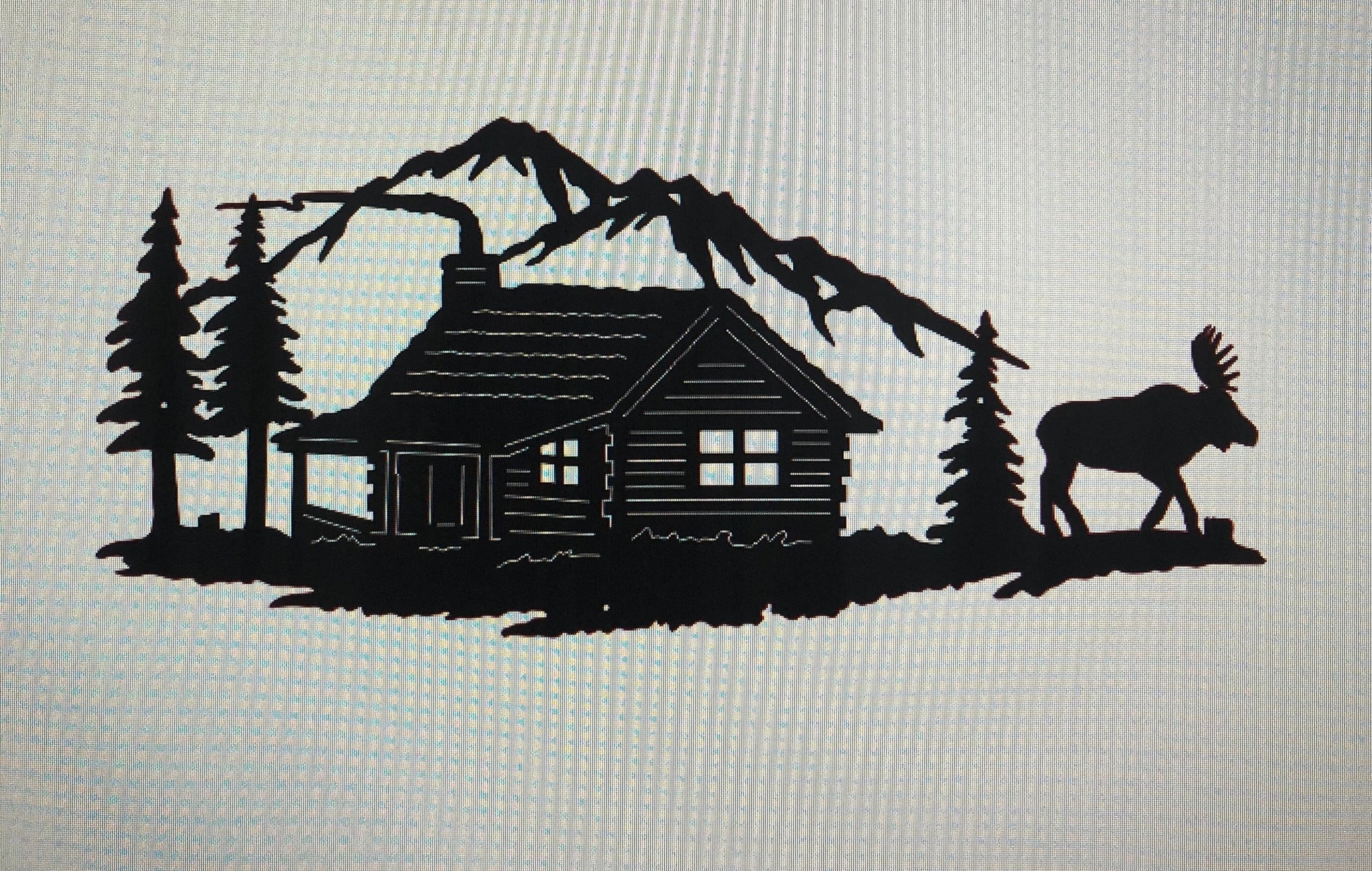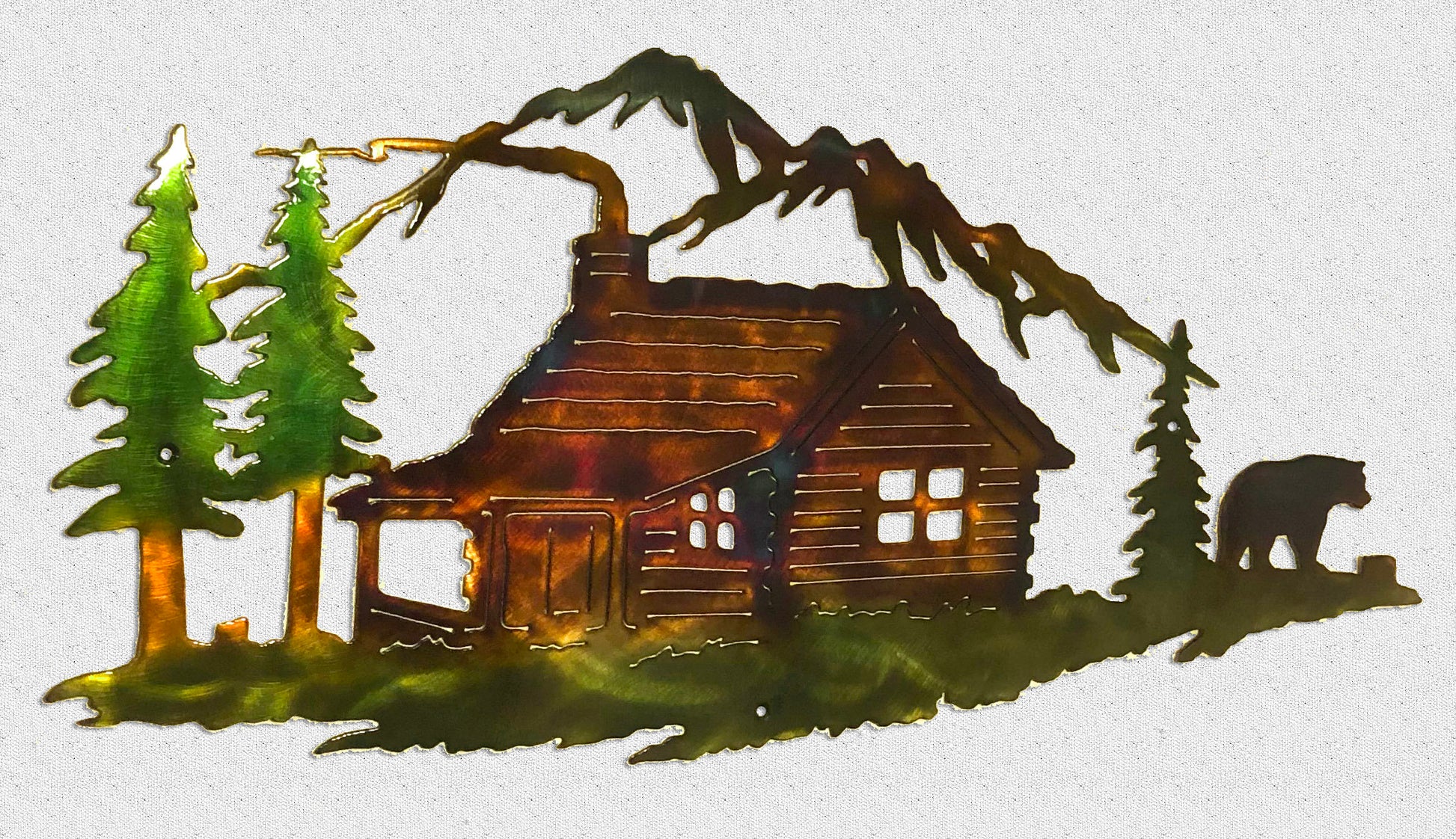 This piece depicts a mountain cabin with smoke rising from the chimney with a bear in the foreground. It is plasma cut from 14 gauge steel and has a hand applied patina finish with a baked-on clear powder coat. Each one of these we make will look somewhat different due to the hand finished patina. It can be displayed indoors or outdoors. It measures approximately 40" wide x 18" high and it weighs about 4 pounds. It has brackets that allow the piece to stand off the wall about 2". It has tunable white led back lighting. It includes a remote and the power adapter.
