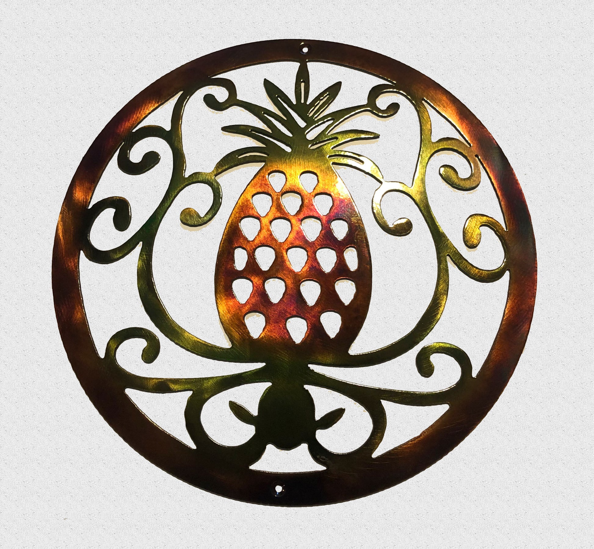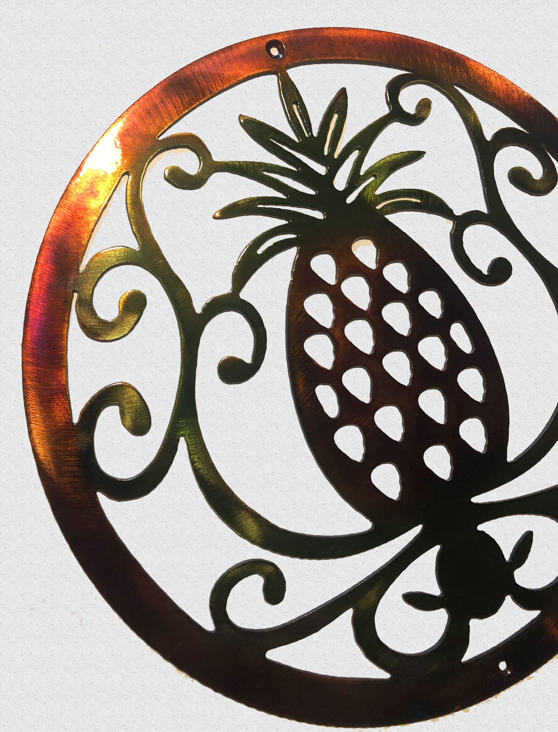 This piece of metal art kitchen decor features a pineapple, with scroll features surrounding it, set in a 12" circle. It is plasma cut from 14 gauge cold finished steel and has a hand finished patina with a baked on clear powder coat. It is durable enough for mounting indoors or outdoors. It's approximately 12" wide x about 12" high.
