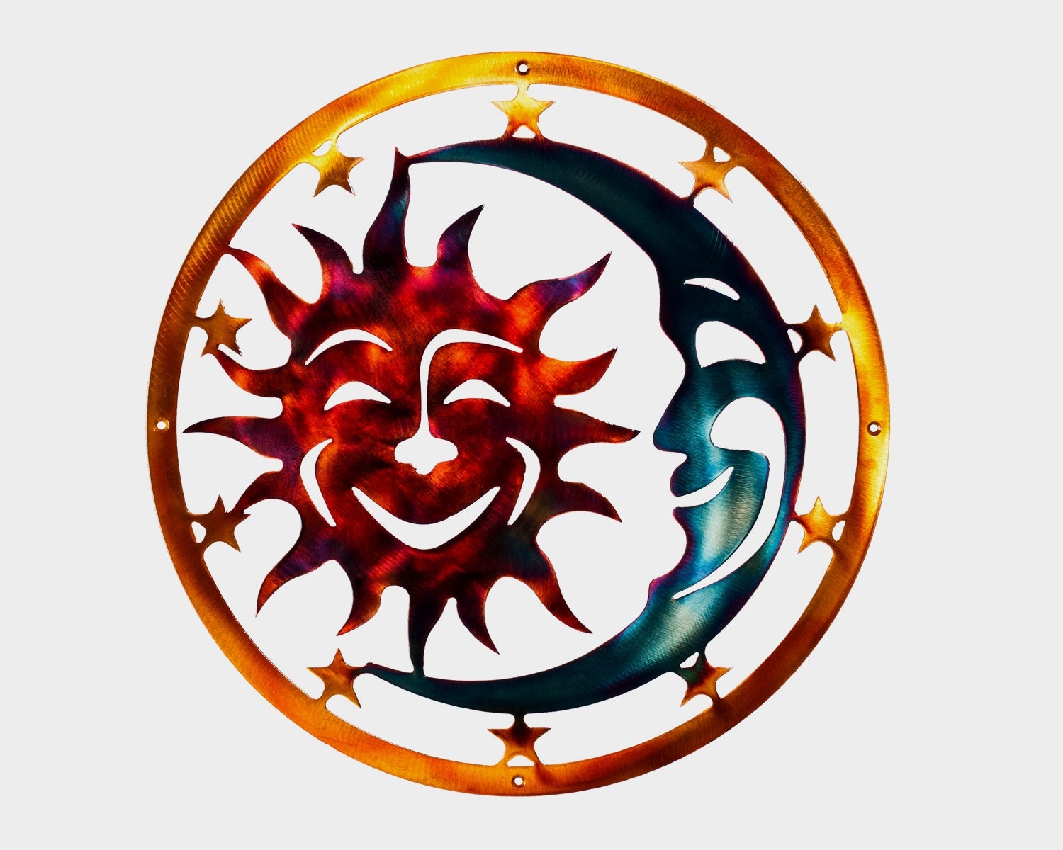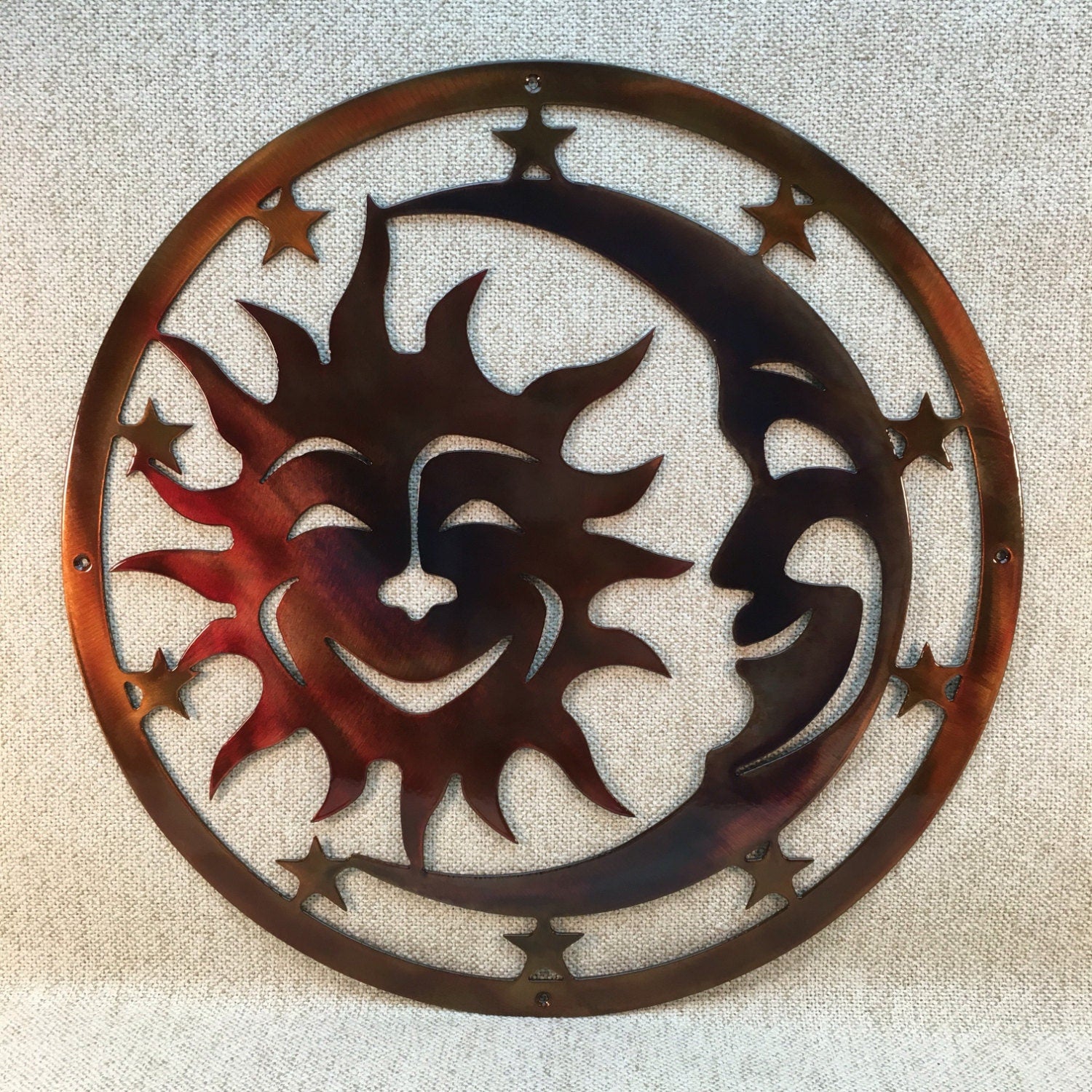 This indoor or outdoor metal wall art piece features the celestial bodies with a sun and half moon surrounded by stars. The patina color is hand applied and protected by a durable baked on gloss clear powder coat. The colors will appear to change depending on the color, angle and intensity of the surrounding light.