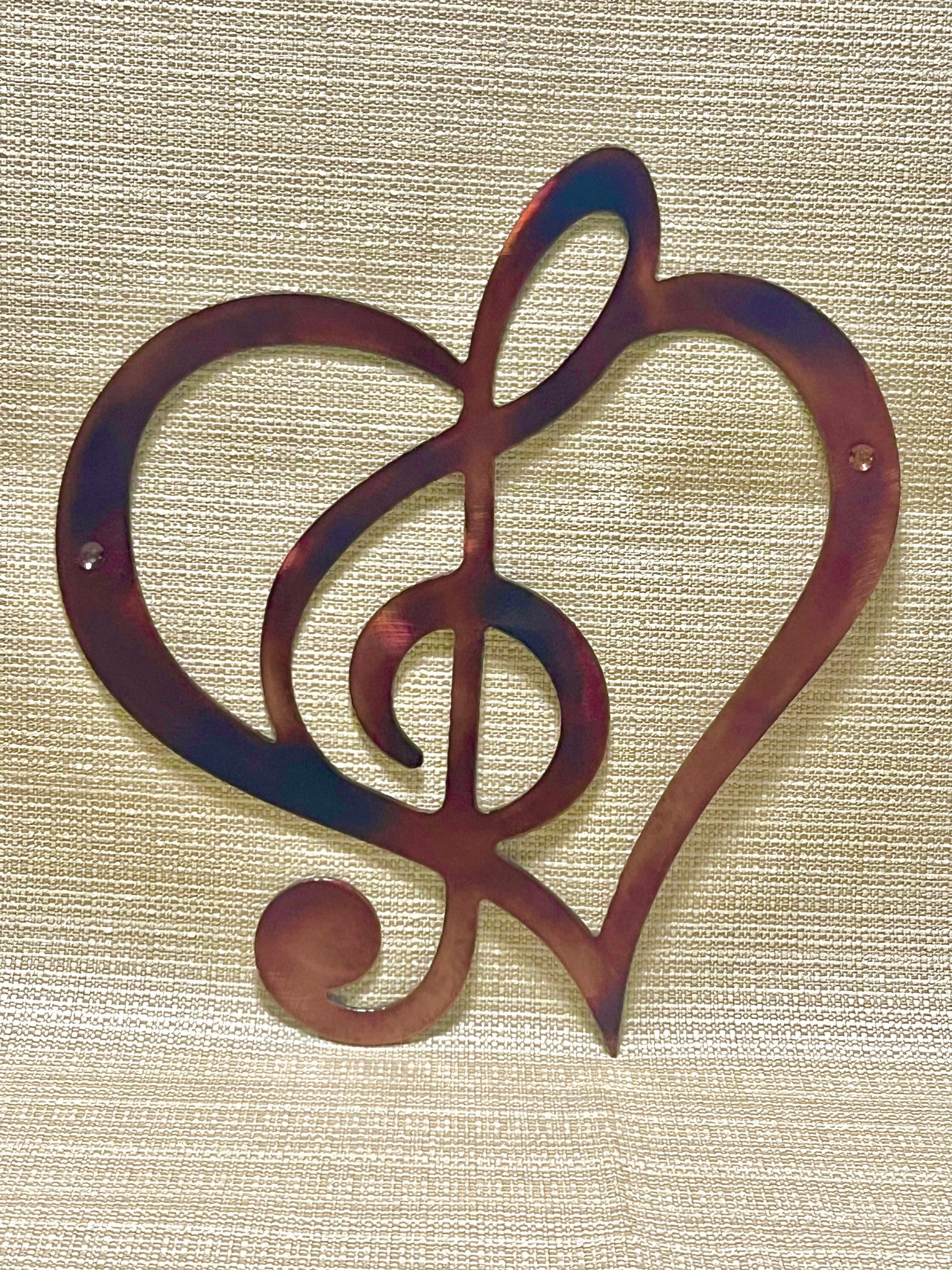 This music themed metal art piece is plasma cut from 14 gauge steel. It features a treble clef music note inside a heart shape. Choose from 3 sizes or ask us about making one a different size to perfectly fit the space you have. Your choice of a black powder coat or a hand applied patina with a clear powder coating. Other colors are available, just ask. It can be hung using small screws or nails.