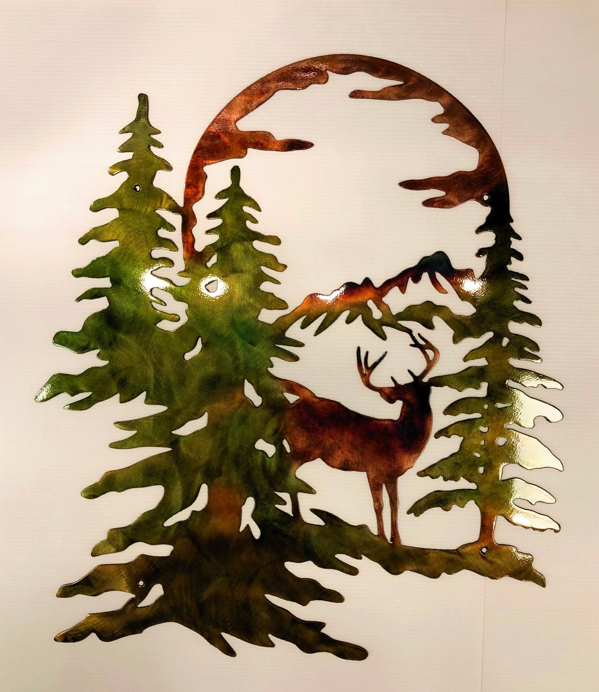 This metal wall art piece depicts a whitetail buck deer picking from a tree with a large moon outline in the background. This piece can make a great accent piece above a fireplace in your home or goes well in a mountain cabin or deer lodge. The finish is a hand applied patina with a durable clear powder coat to keep the piece looking good for many years and can be displayed indoors or outdoors. The colors will change depending on the intensity, color, and angle of surrounding light. This metal art piece is approximately 24" wide x 24" high and made from 14 gauge steel. It has holes provided that can be used for mounting.