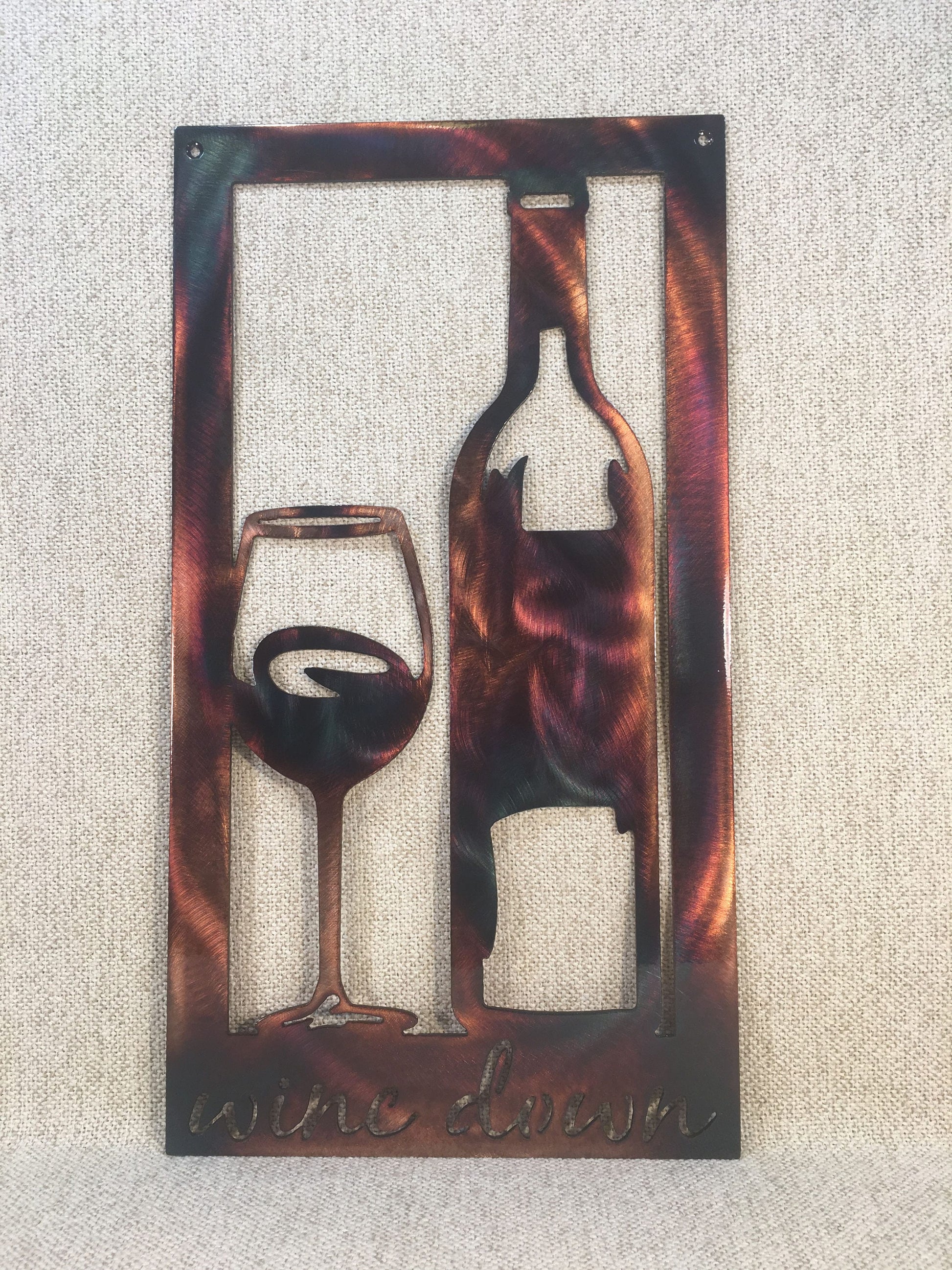This unique metal art piece can dress up your wine bar or kitchen decor. It features a wine bottle and glass with the words "Wine Down" at the bottom. It is plasma cut from 14 gauge steel and has a hand finished patina finish with a durable clear powder coat baked on. It can be displayed indoors or outdoors.