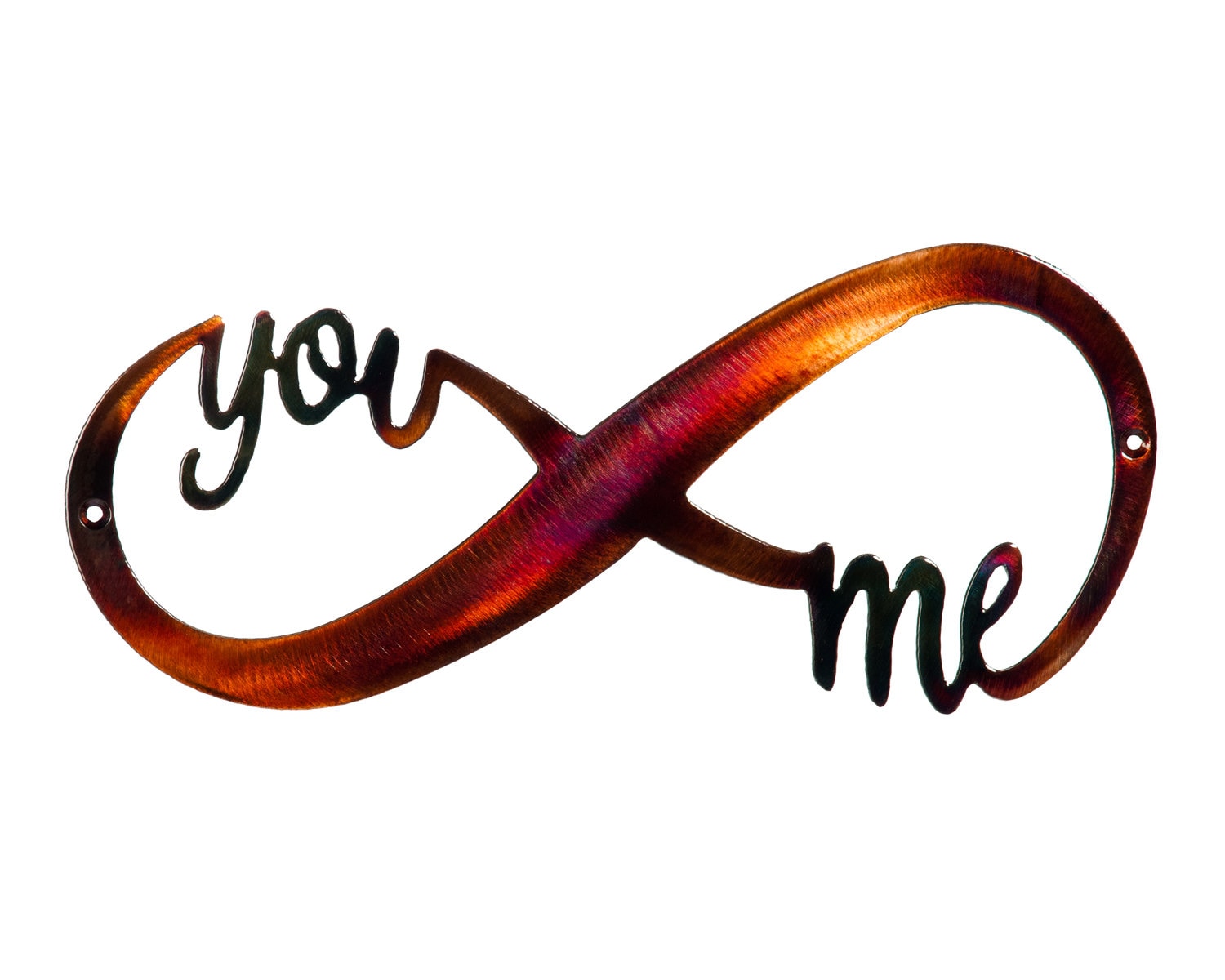 This metal art piece is plasma cut from 14 gauge steel. It features the words You and Me incorporated into an infinity ribbon. It measures about 12"W x 5"H and weighs less than 1lb. It can be hung using small screws or finish nails (not included). It has a hand applied patina finish with a gloss clear powder coat that makes a finish durable enough for displaying indoors or outdoors.